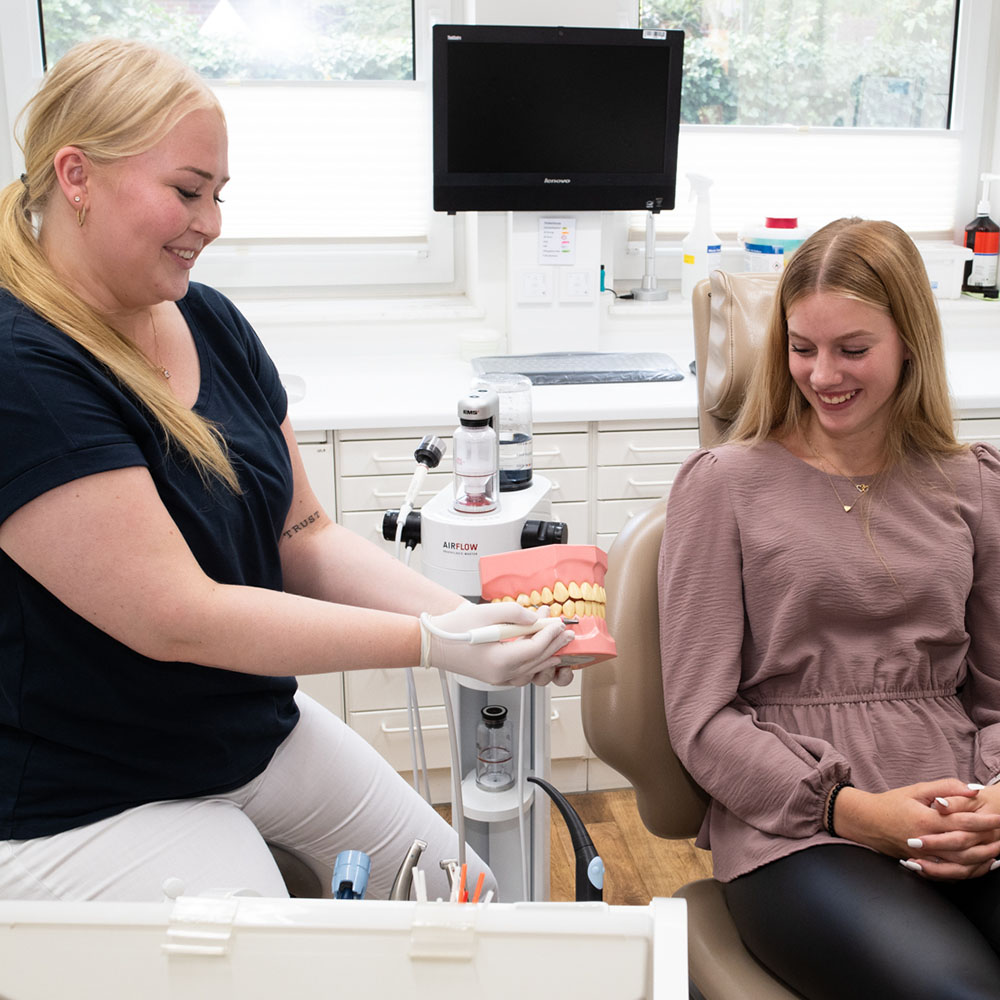 Für einen langfristigen Erhalt der Mund- und Zahngesundheit bieten wir Ihnen eine sanfte und effiziente Zahnreinigung durch geschultes Personal das auf Ihre Bedürfnisse eingeht. Wir sind zertifizierte EMS Prophylaxis MasterAnwender.